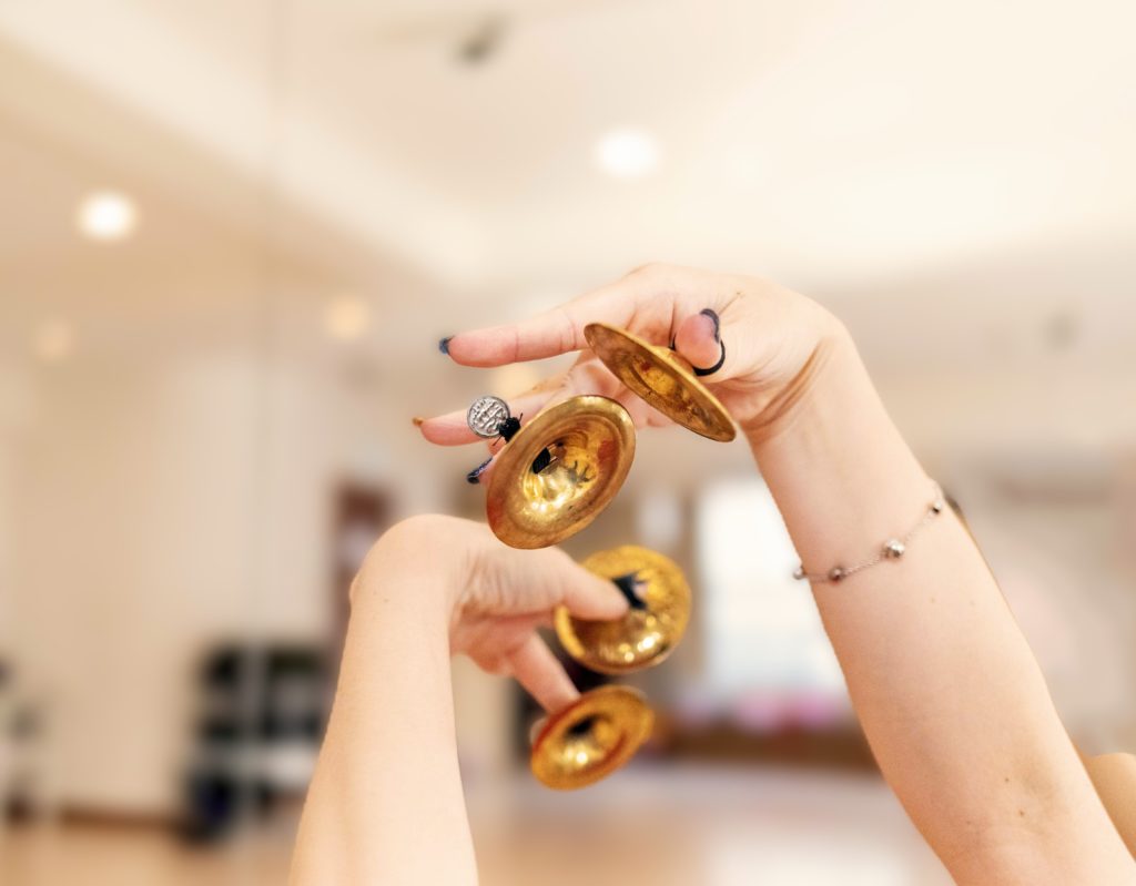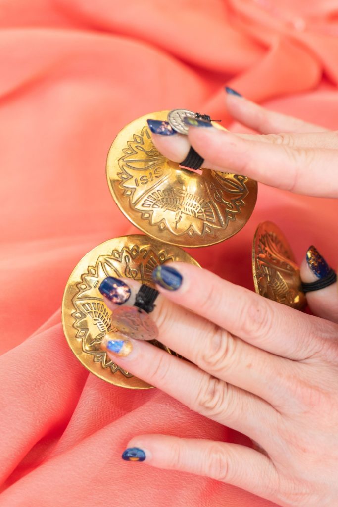 両手の親指と中指に装着してそれぞれ打ち合わせることでリズムを奏でる楽器で、英語で「フィンガーシンバル」、アラビア語で「サガット」とも呼ばれています。