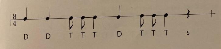 T テ/タ…高い音。ダラブッカの縁を叩いたときの音。